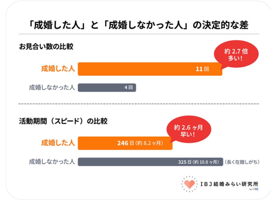 成婚した女性は平均11回のお見合いをしていますが、成婚しなかった人は平均4回で止まっています。その差は2.7倍。